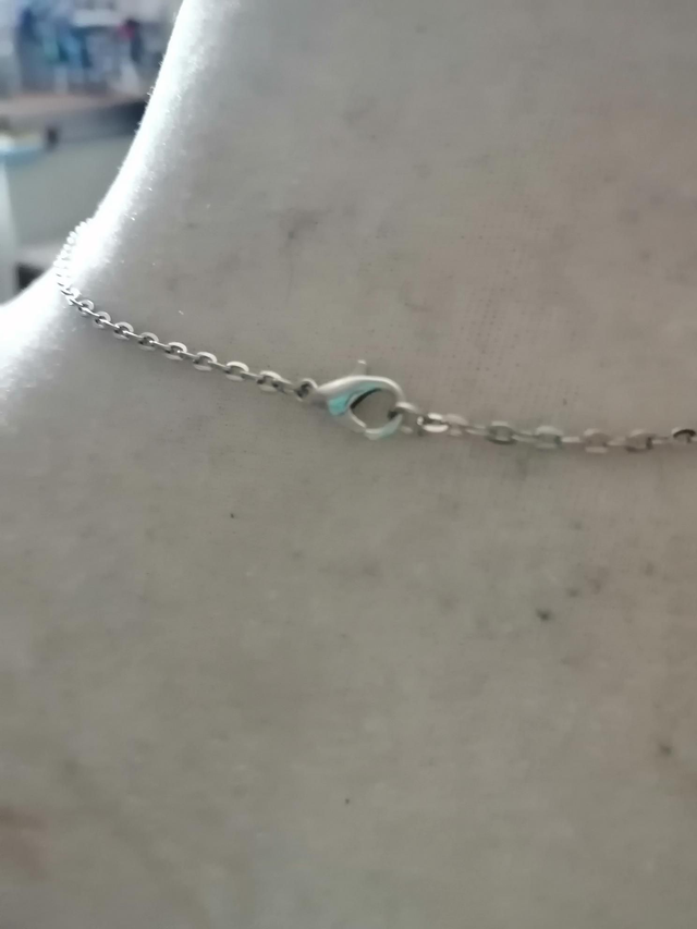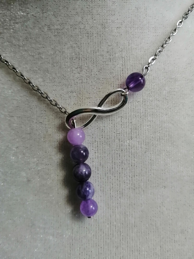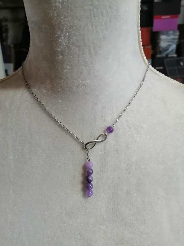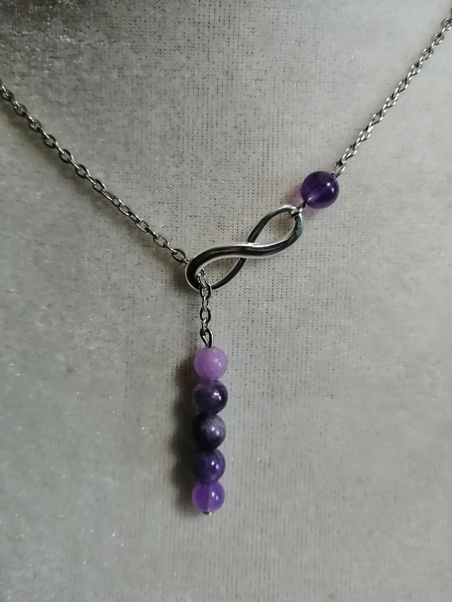 Collier INFINI en acier et perles d' améthyste 6 mm. Fermeture homard et rallonge 5 cm